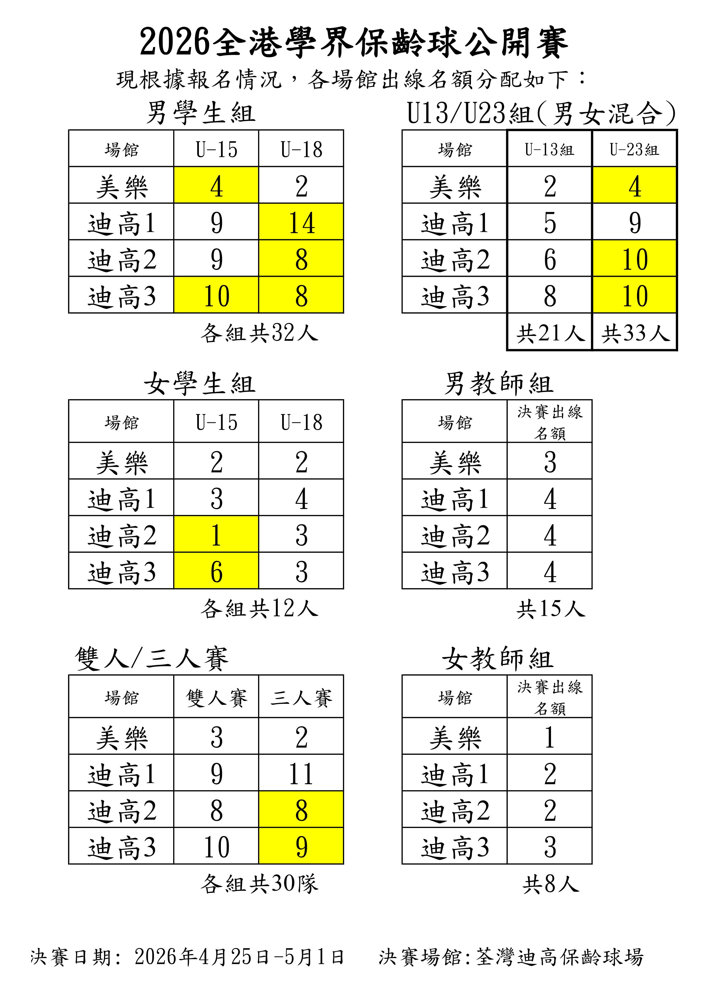 <<2026年全港學界青少年保齡公開賽初賽最新安排>>